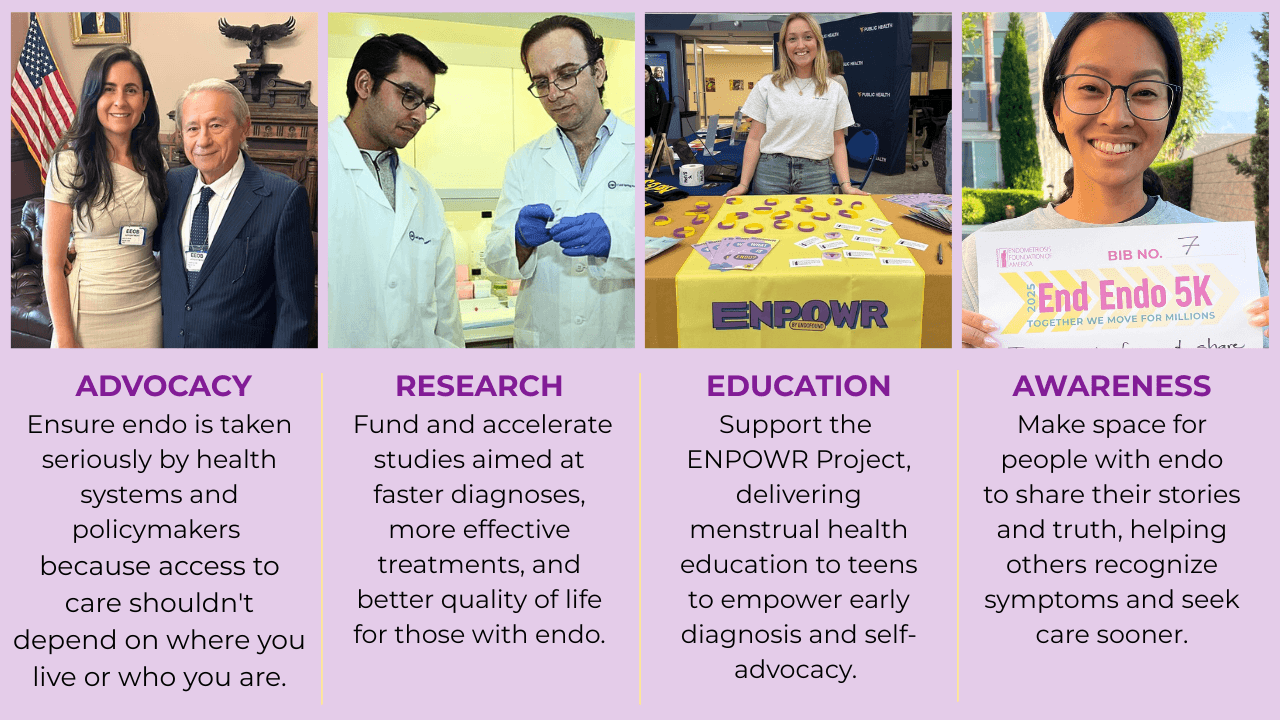 Endo doesn’t just impact the person living with it. It affects everyone around them — family, friends, partners, co-workers, and classmates. And for too long, it’s been misunderstood, underfunded, and pushed aside by in the medical field. But your donation helps us change that.